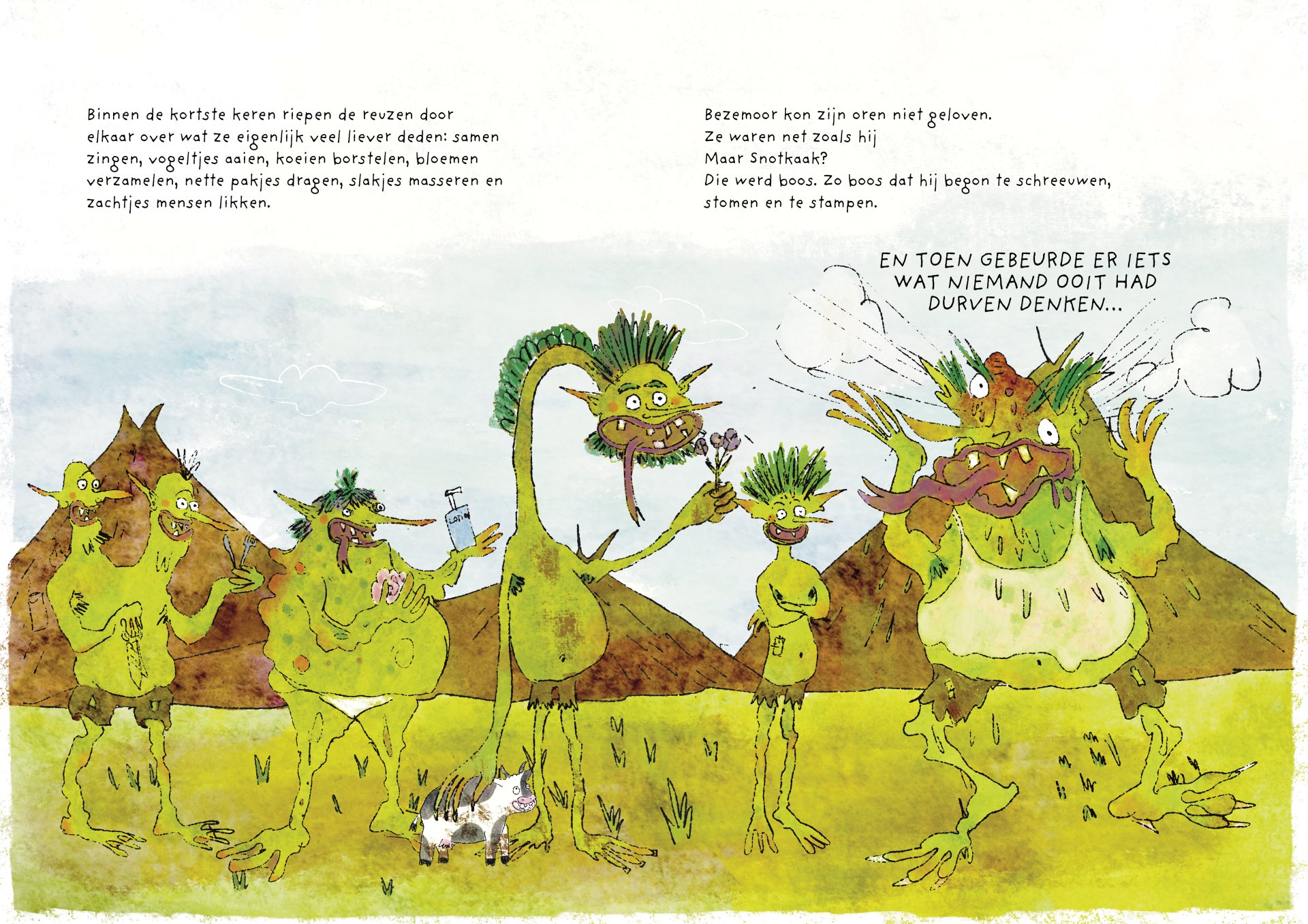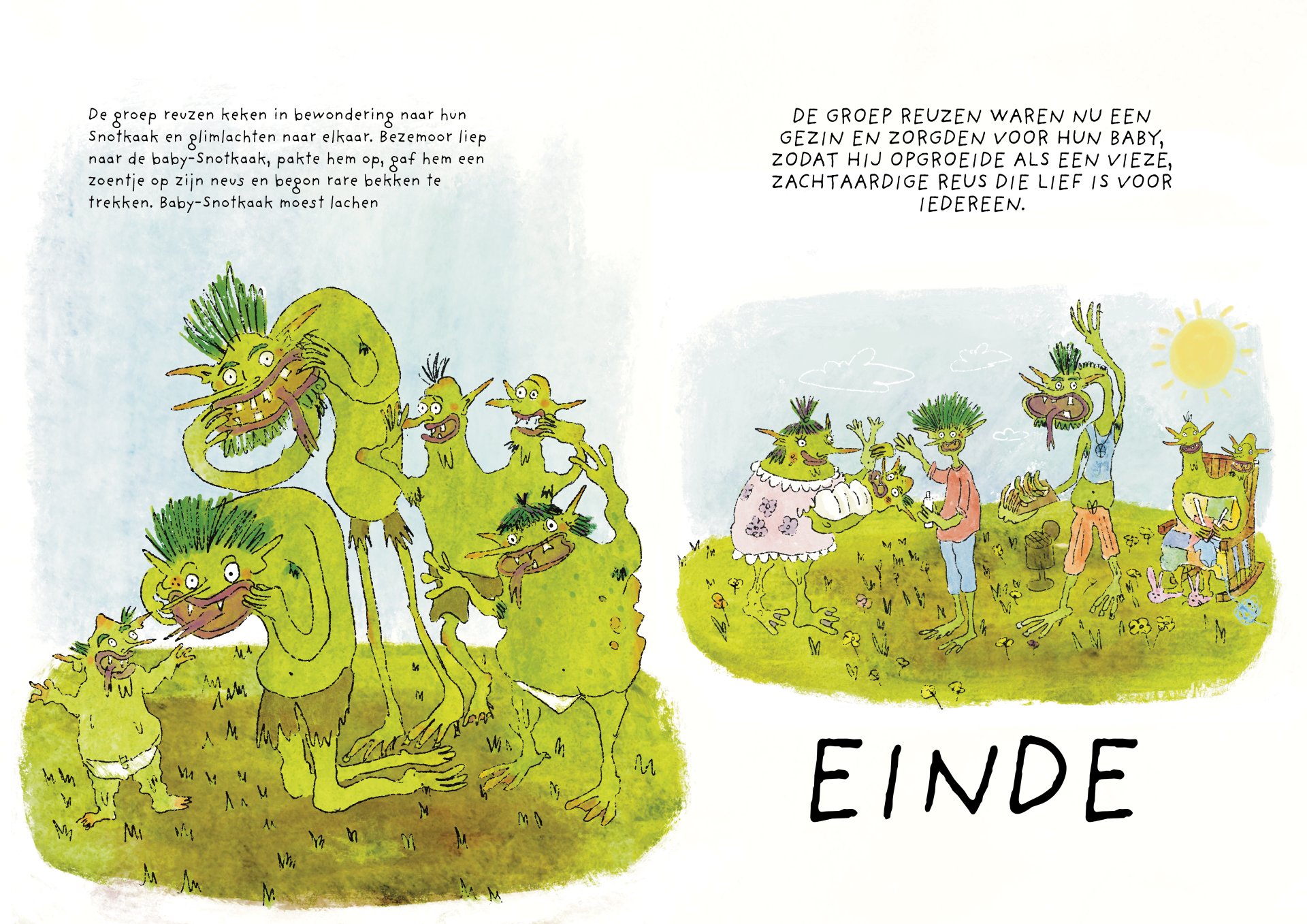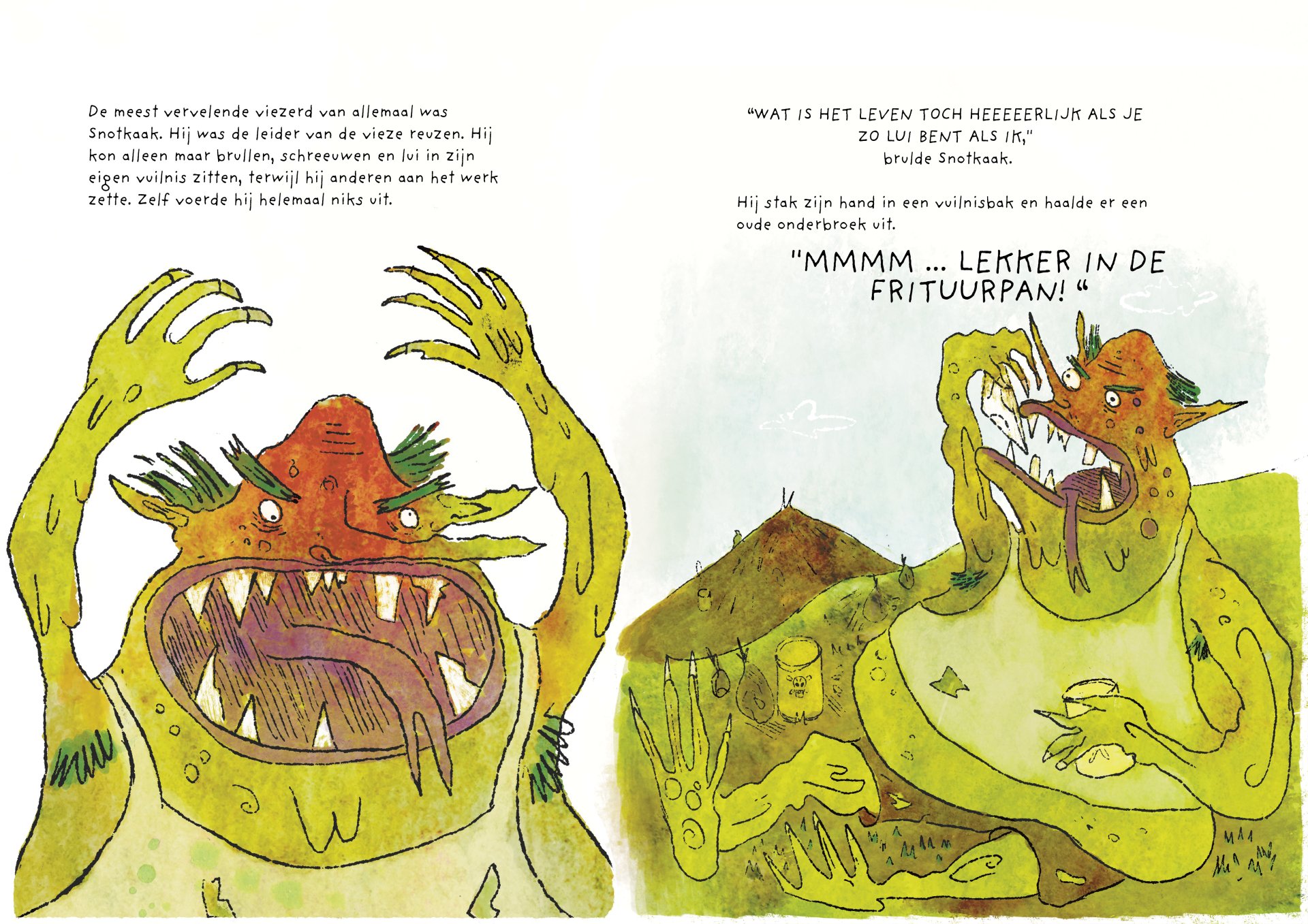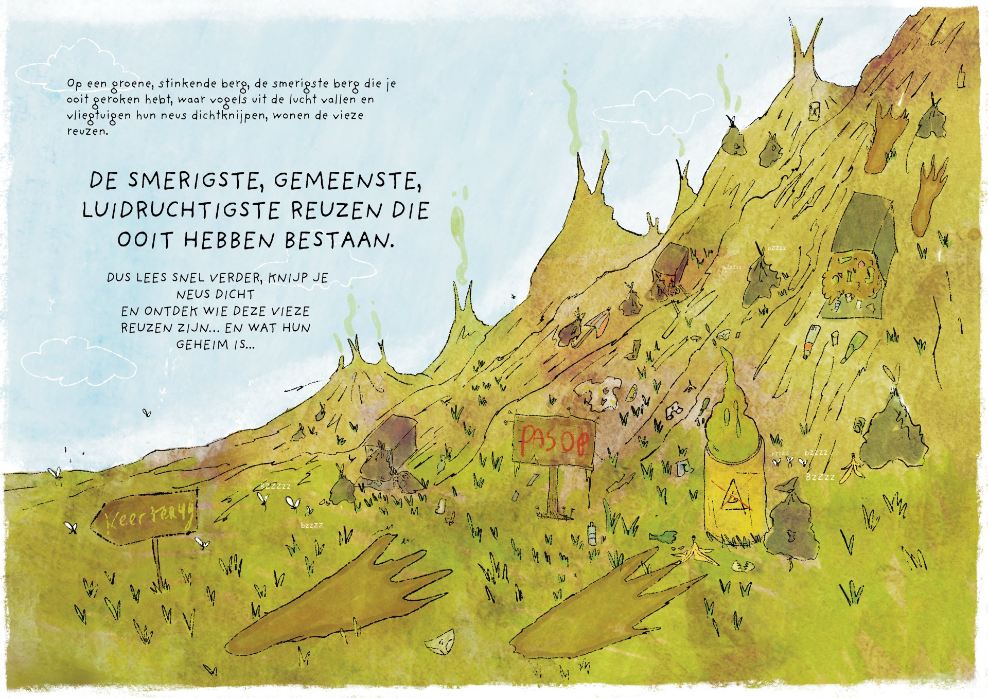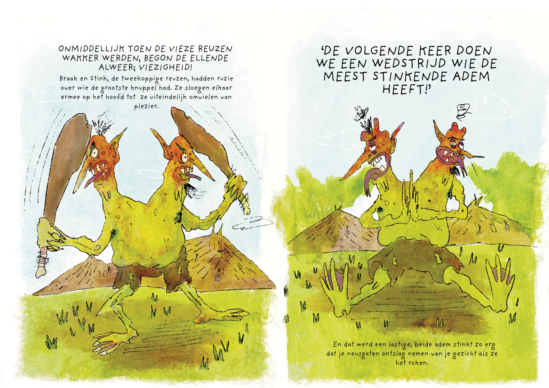Tijdens mijn minor heb ik vier maanden gewerkt aan de ontwikkeling van het kinderboek De vieze reuzen – Een gigantisch geheim. Het verhaal volgt een groep vieze, luidruchtige reuzen die alles om zich heen vies maken, ruzie maken en zich stoer gedragen, maar ondertussen ieder hun eigen geheim met zich meedragen. Onder de humoristische en groteske oppervlakte behandelt het boek persoonlijke en kwetsbare thema’s. Het is gebaseerd op mijn eigen ervaringen met toxische mannelijkheid, het verlies van mijn vader aan alcoholisme op zesjarige leeftijd, en het opgroeien als een zachtaardig kind dat daarmee gepest werd. Dit project was voor mij een uitdaging om zowel mijn illustratie- als schrijfvaardigheden verder te ontwikkelen, en tegelijkertijd luchtigheid en humor in mijn werk te brengen.