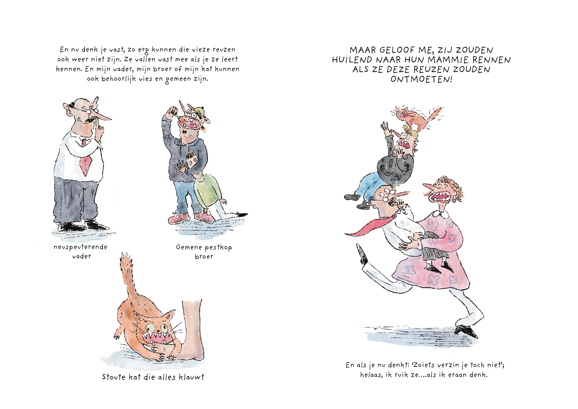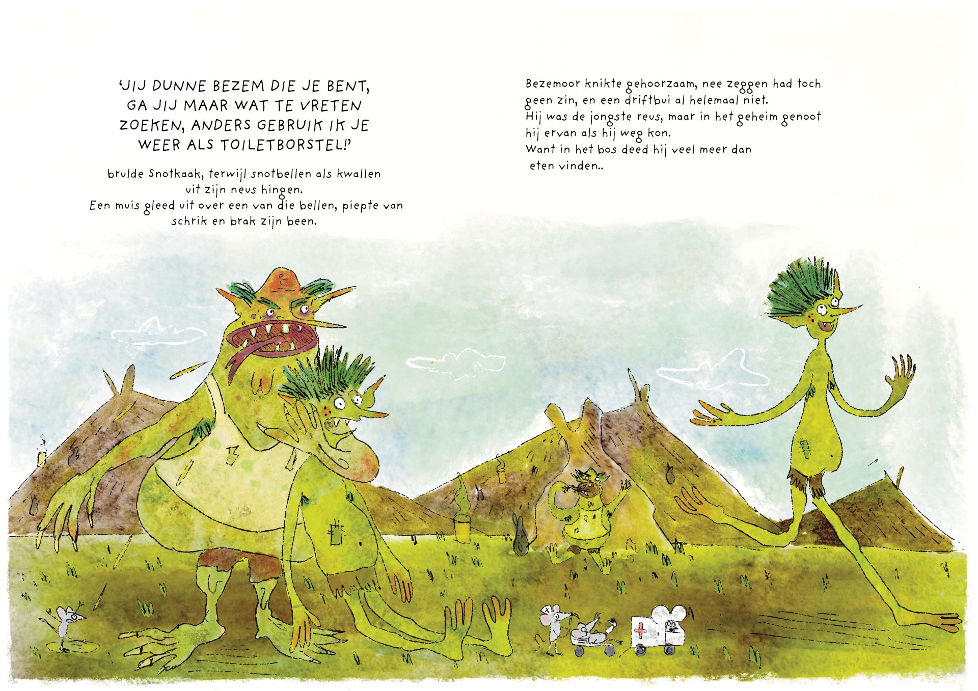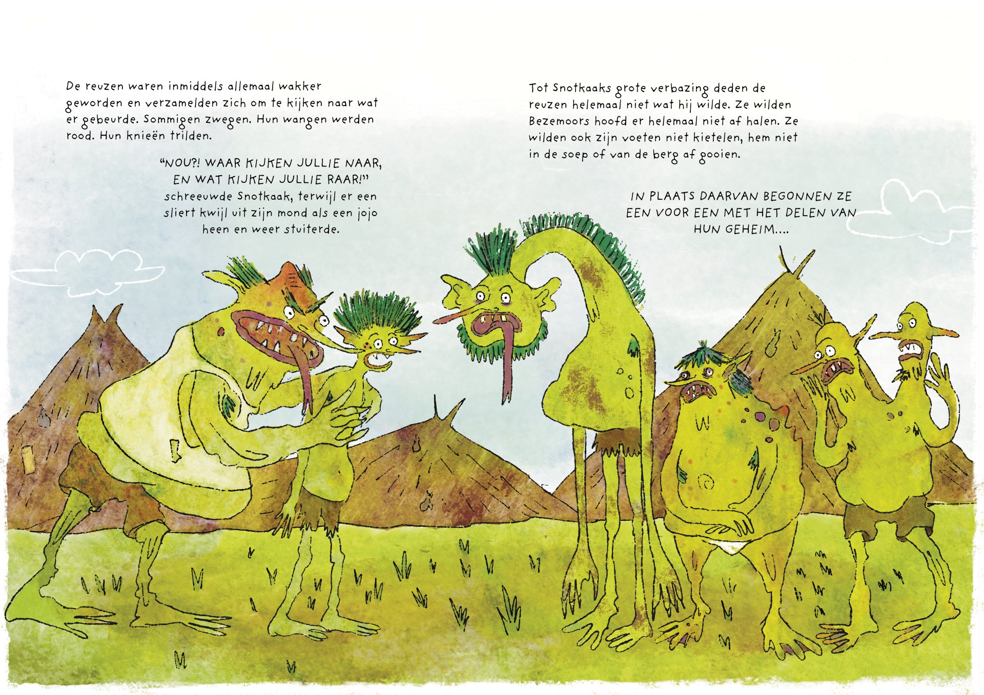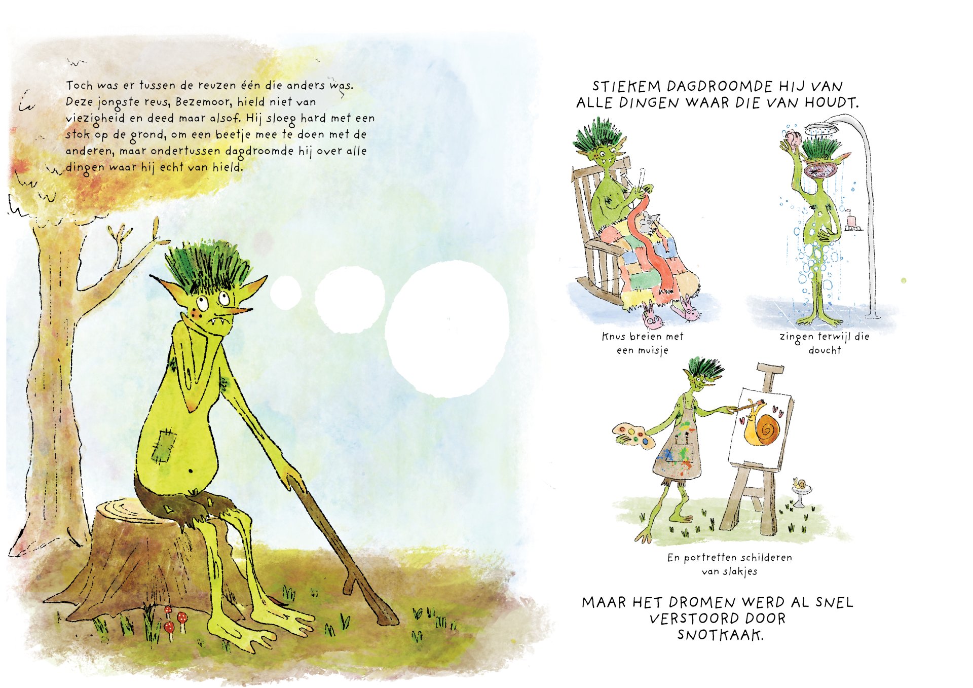 Tijdens mijn minor heb ik vier maanden gewerkt aan de ontwikkeling van het kinderboek De vieze reuzen – Een gigantisch geheim. Het verhaal volgt een groep vieze, luidruchtige reuzen die alles om zich heen vies maken, ruzie maken en zich stoer gedragen, maar ondertussen ieder hun eigen geheim met zich meedragen. Onder de humoristische en groteske oppervlakte behandelt het boek persoonlijke en kwetsbare thema’s. Het is gebaseerd op mijn eigen ervaringen met toxische mannelijkheid, het verlies van mijn vader aan alcoholisme op zesjarige leeftijd, en het opgroeien als een zachtaardig kind dat daarmee gepest werd. Dit project was voor mij een uitdaging om zowel mijn illustratie- als schrijfvaardigheden verder te ontwikkelen, en tegelijkertijd luchtigheid en humor in mijn werk te brengen.
