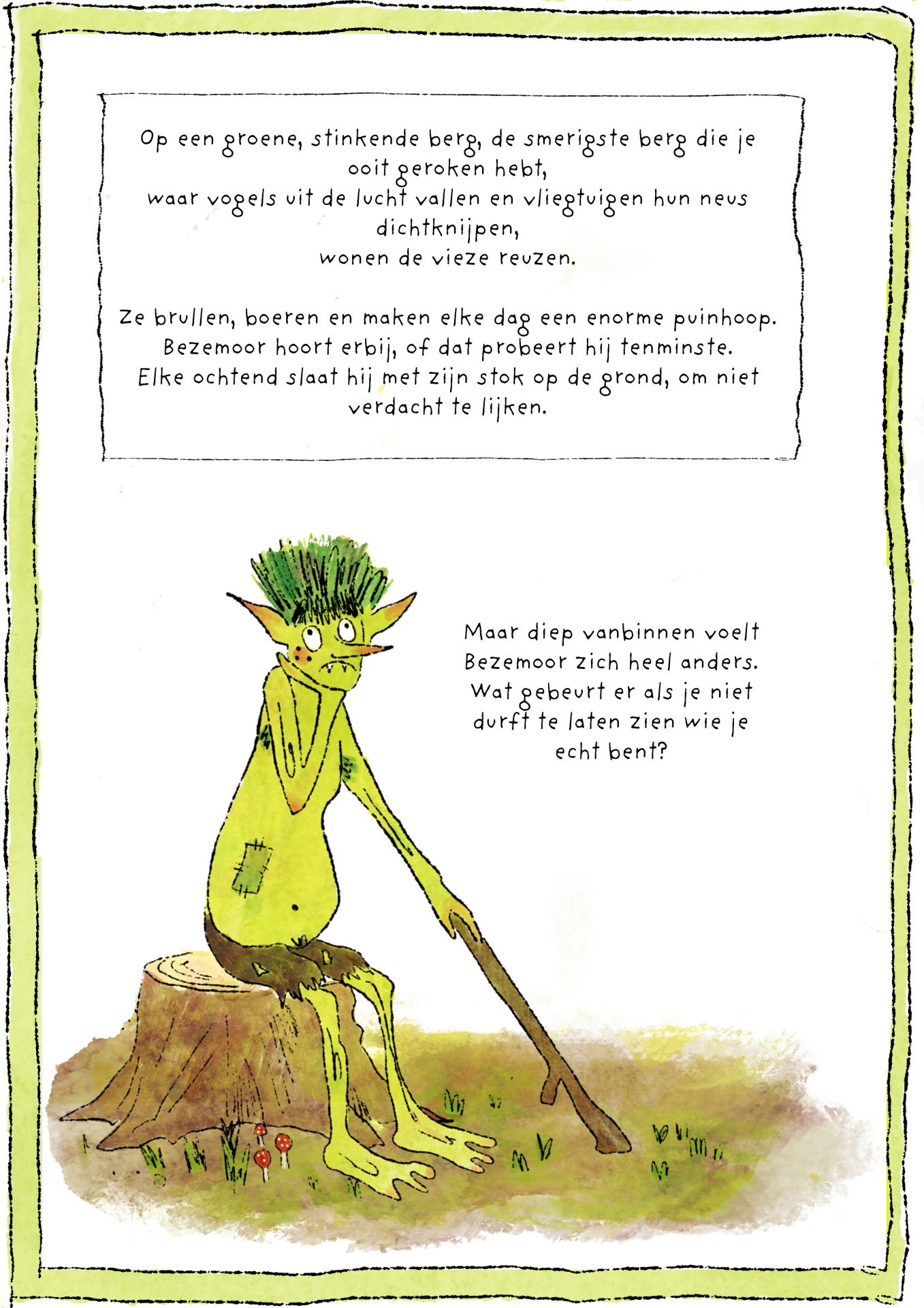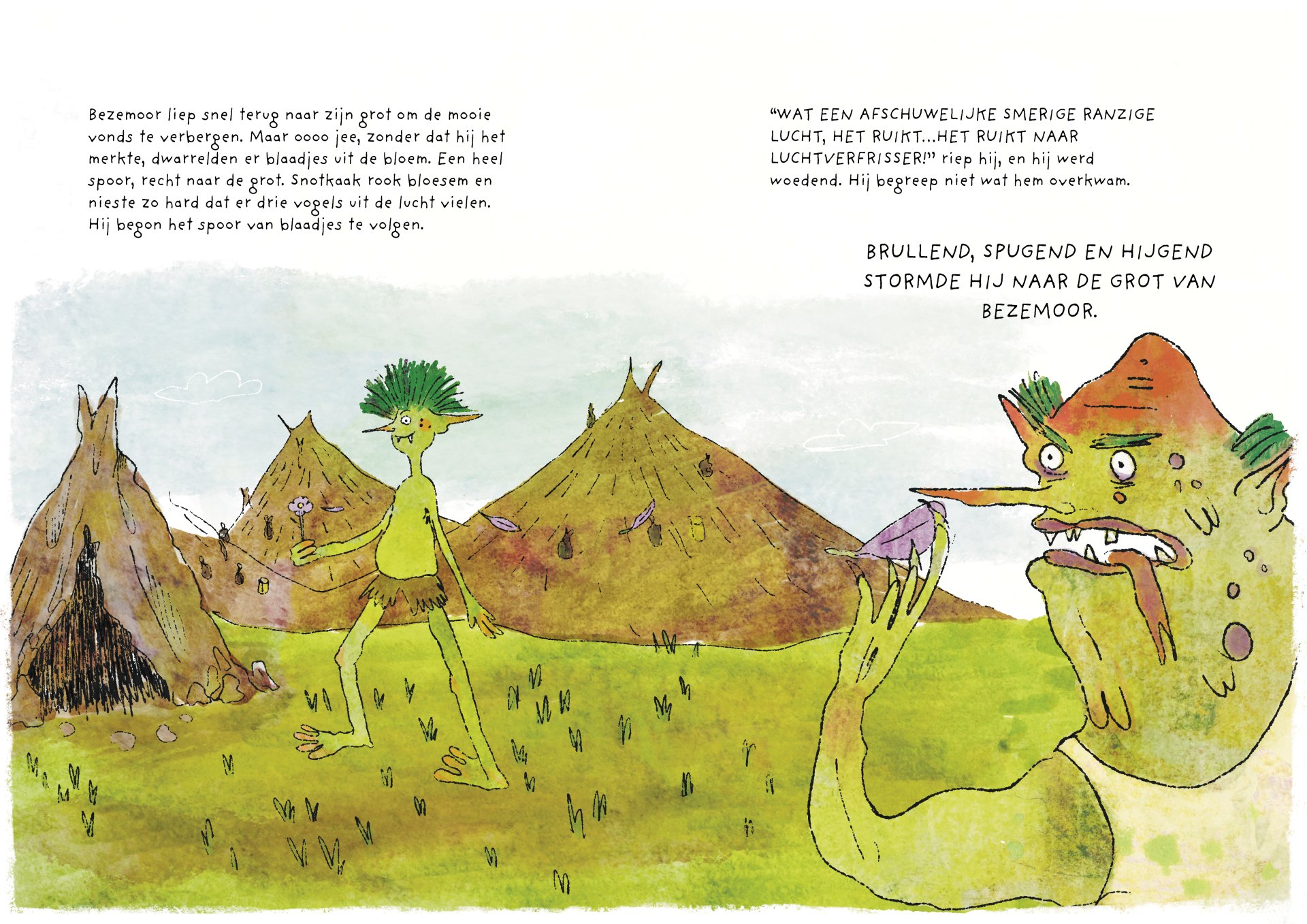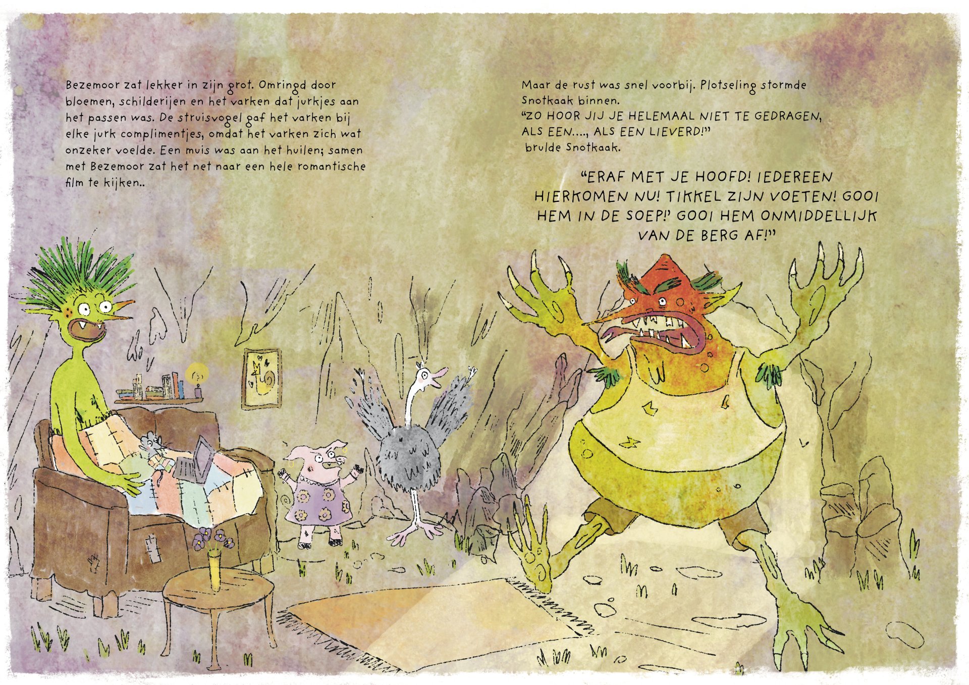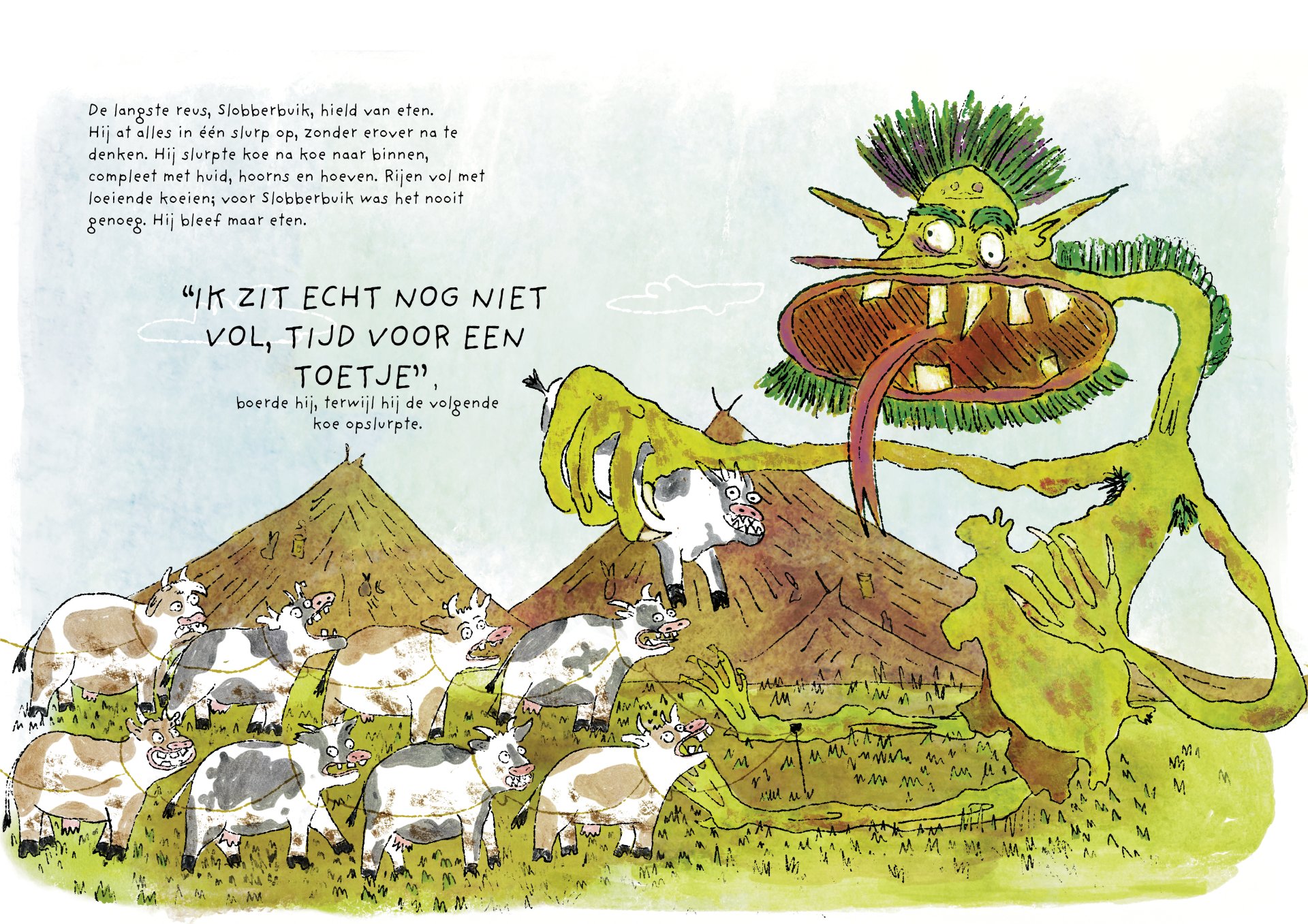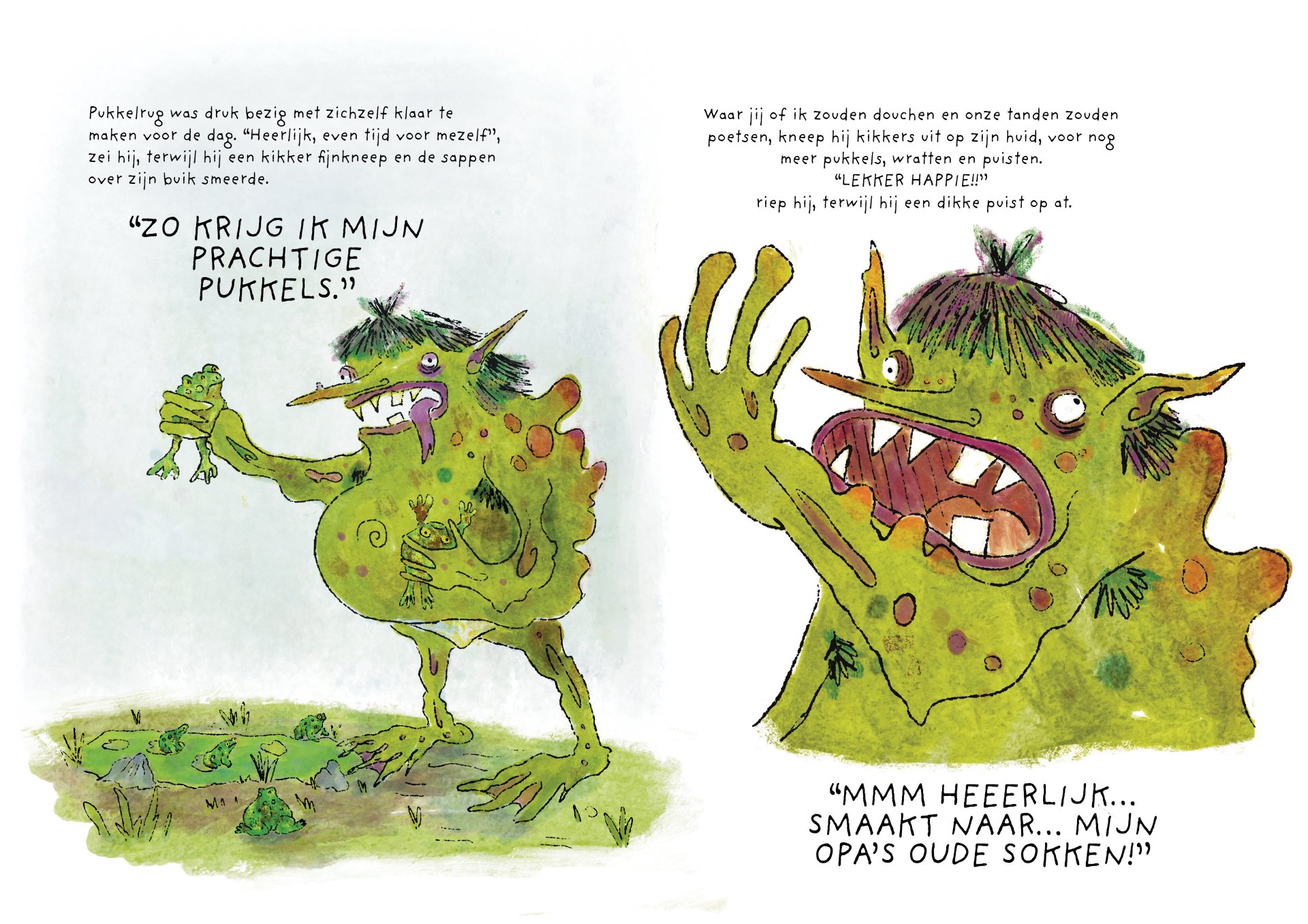 Tijdens mijn minor heb ik vier maanden gewerkt aan de ontwikkeling van het kinderboek De vieze reuzen – Een gigantisch geheim. Het verhaal volgt een groep vieze, luidruchtige reuzen die alles om zich heen vies maken, ruzie maken en zich stoer gedragen, maar ondertussen ieder hun eigen geheim met zich meedragen. Onder de humoristische en groteske oppervlakte behandelt het boek persoonlijke en kwetsbare thema’s. Het is gebaseerd op mijn eigen ervaringen met toxische mannelijkheid, het verlies van mijn vader aan alcoholisme op zesjarige leeftijd, en het opgroeien als een zachtaardig kind dat daarmee gepest werd. Dit project was voor mij een uitdaging om zowel mijn illustratie- als schrijfvaardigheden verder te ontwikkelen, en tegelijkertijd luchtigheid en humor in mijn werk te brengen.
