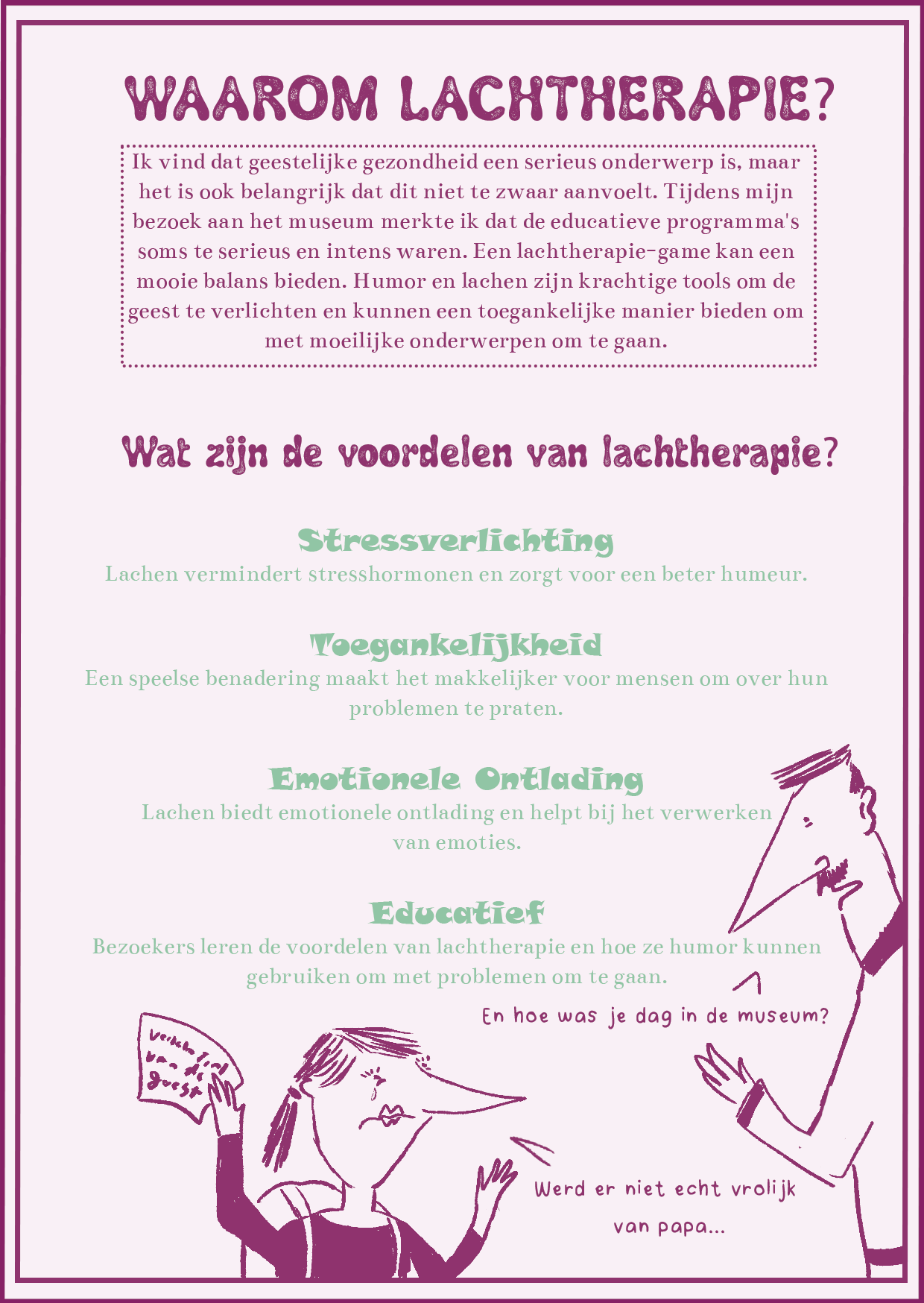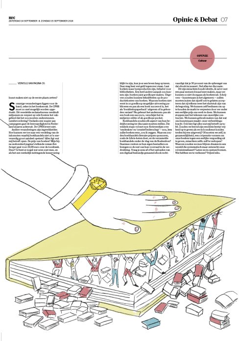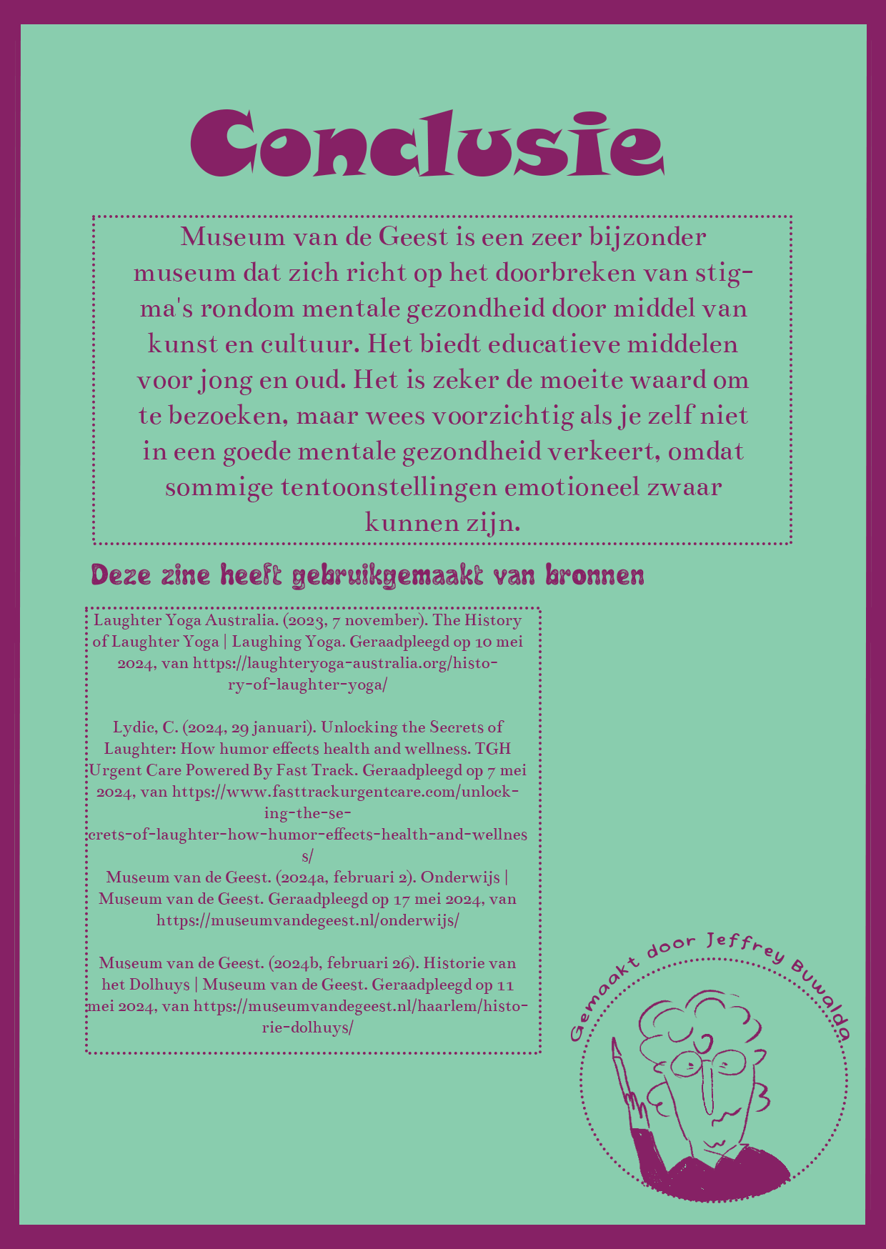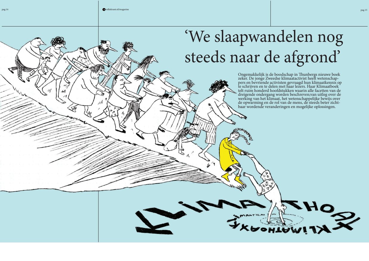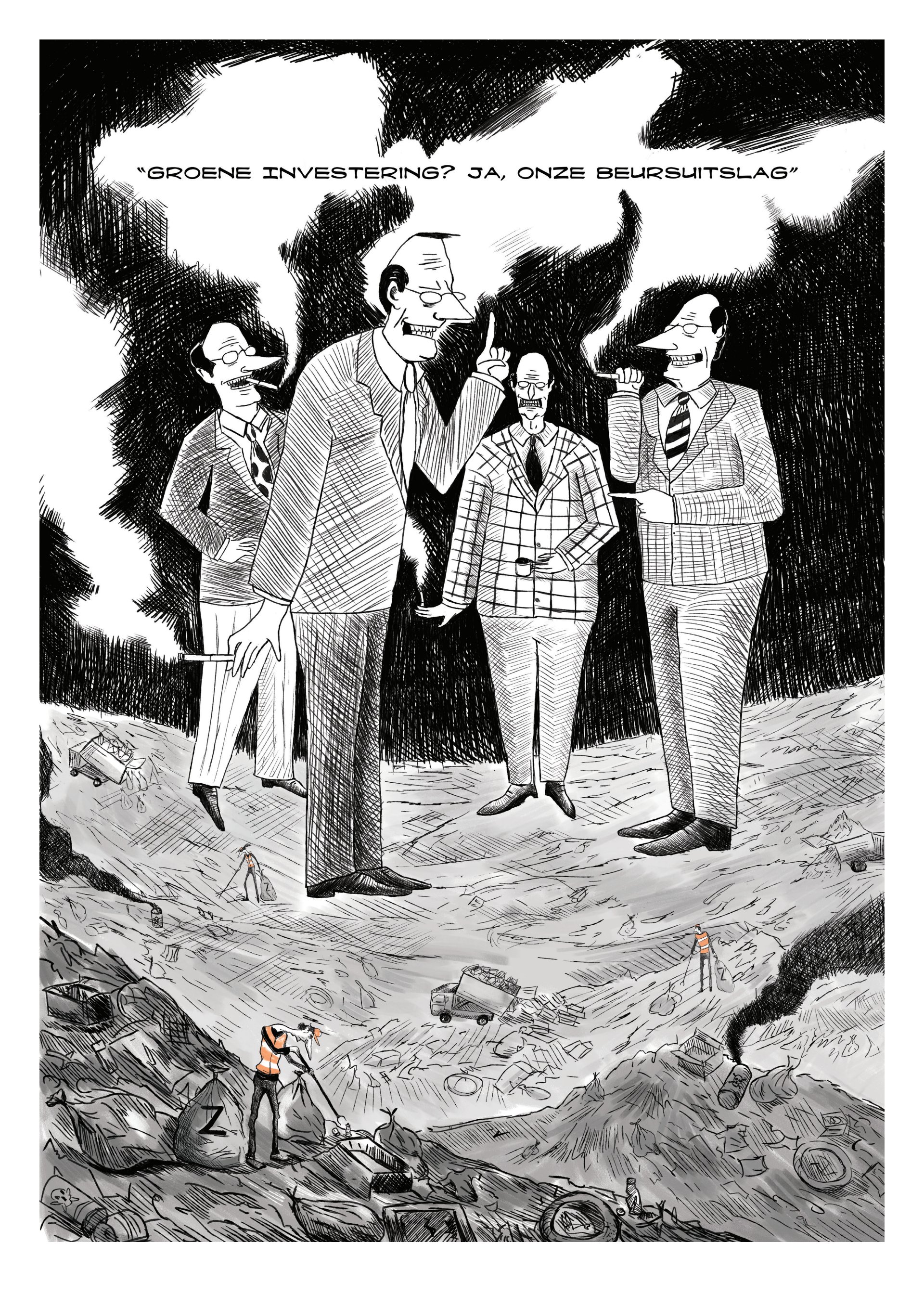 In jaar 1 van de kunstacademie hadden we, samen met het Beeld en Geluid museum, een redactioneel illustratieproject. We kregen een bestaande illustratie aangereikt, waarvan we een eigen variant moesten maken. Ik kreeg een illustratie van Harmen van Straatten. In mijn versie heb ik de schoorstenen en de schoonmaker veranderd in rijke babyboomer-zakenmannen die alles weglachen en slechte grappen maken, terwijl ze hun beloftes over milieubeleid niet nakomen. De schoonmaker heb ik veranderd in Gen Z, die het vuil van de babyboomers moet opruimen. Mijn illustratie werd uiteindelijk geselecteerd om in het museum getoond te worden.